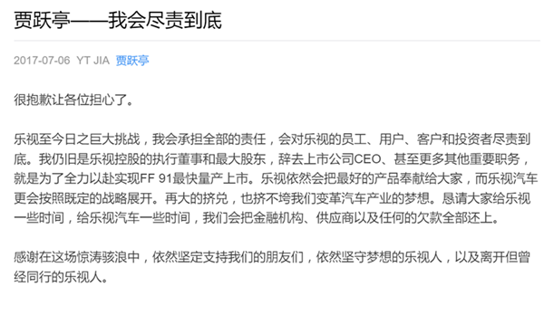 乐视至今日之巨大挑战,我会承担全部的责任,会对乐视的员工、用户、客户和投资者尽责到底。我仍旧是乐视控股的执行董事和最大股东,辞去上市公司CEO、甚至更多其他重要职务,就是为了全力以赴实现FF 91最快量产上市。乐视依然会把最好的产品奉献给大家,而乐视汽车更会按照既定的战略展开。再大的挤兑,也挤不垮我们变革汽车产业的梦想。恳请大家给乐视一些时间,给乐视汽车一些时间,我们会把金融机构、供应商以及任何的欠款全部还上。