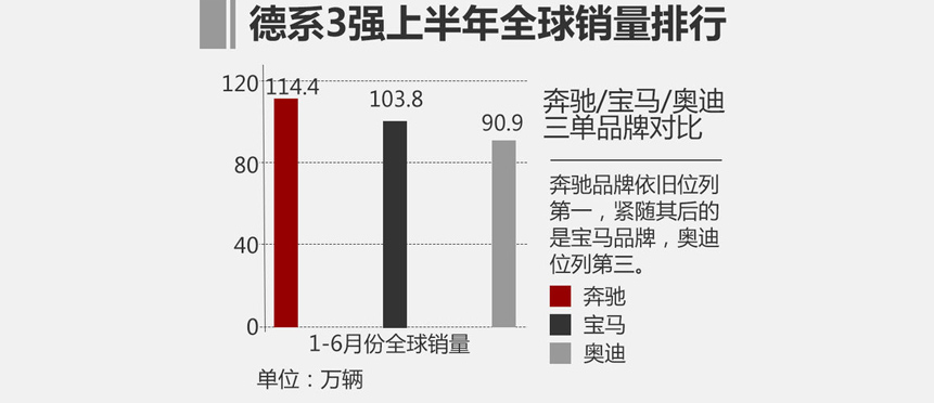 而我们今天要重点说的是中国市场,从6月份的销量中来看,BBA的销量排名已经悄然发生变化。梅赛德斯-奔驰及smart品牌在华销售52,116辆新车,依然保持两位数的增长,高达27%;奥迪品牌6月份销量为51,651辆,实现了进入今年以来的首次增长,增幅为1.7%;根据宝马刚刚公布的数据,6月份宝马和MINI品牌在华销量为50,527辆,同比增长11.54%。从这一组数据中来看,奥迪将销量追回至第二,与奔驰含smart的销量相比也仅差465台。