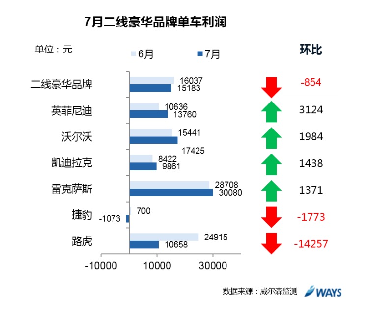 来自市场咨询机构威尔森的调查数据显示,今年豪华车市场的单车利润从2月份开始,便出现持续下滑之势。7月一线品牌单车利润小幅上升890元,但二线品牌单车利润仍然持续下滑,环比下降854元。具体到品牌层面,7月份捷豹、路虎终端支持力度下降,导致利润环比出现较大降幅,捷豹单车利润转为负值。