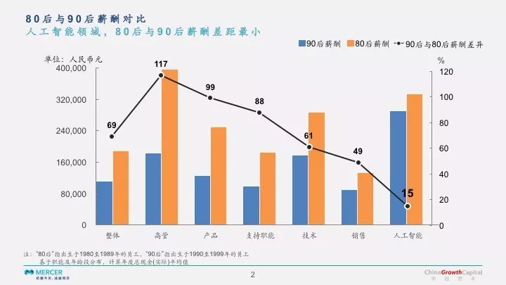 目前 80 后(出生于 1980-1989 年的员工,下同)和 90 后(出生于 1990-1999 年的员工,下同)已经成为中国互联网早期企业的绝对主力人群,本次报告调研的近 2 万个真实样本中,「80 后+90 后」占据了 9 成比例以上。在将所有样本中的 80 后和 90 后按照不同职能进行划分后发现:早期企业中的 80 后与 90 后薪酬水平整体相差 69%;而受管理经验的影响,80 后和 90 后的高管薪酬差距最大,比例达到 117%;但在人工智能领域,由于相关人才的供不应求,使得这种差距并不明显,只有 15%。