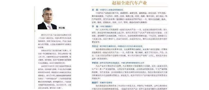 中国汽车产业发展百转千回,汹涌澎湃;真假专家,遍地都是;研究文章,汗牛充栋;唯有福全教授,干过外企、国资、民营,熟悉开发、经营、战略,精于分析,善于表达,转行产业研究,实乃行业幸事!强烈推荐《赵福全论汽车产业》一书,相信无论战略、战术,宏观、微观,还是技术、经济、人才、管理,都会对读者大有裨益!