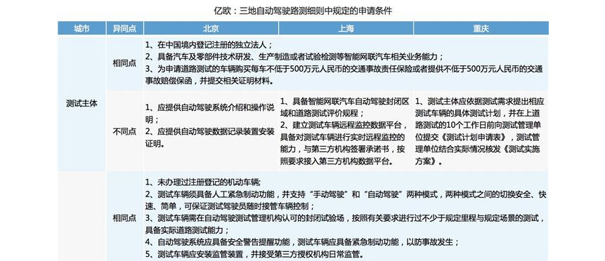 亿欧汽车对比了三地的自动驾驶道路测试实施细则,发现——并没有什么太大的区别。