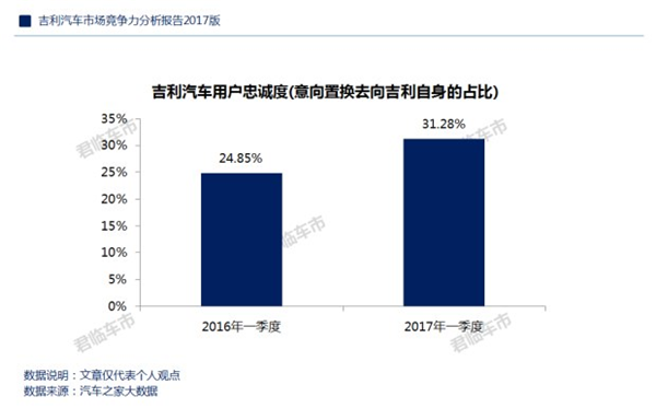 大数据分析: 2017年一季度吉利汽车品牌忠诚度31.28%,提升25.88% 1、2017年一季度吉利汽车用户忠诚度31.28%,提升25.88% 2、博越、帝豪GS等新车大幅提升了吉利汽车用户的忠诚度 3、留住博越、博瑞等用户,将是吉利汽车下一阶段的核心课题之一